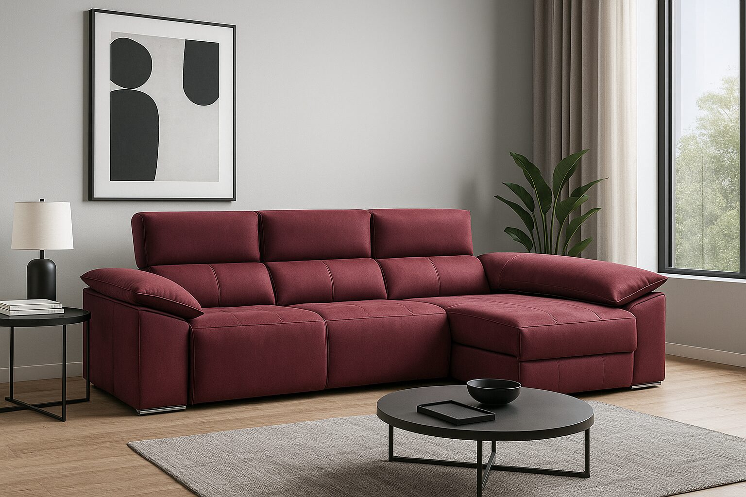 Sofá Chaiselongue motorizado, cabezales reclinables y brazos tipo almohadilla.